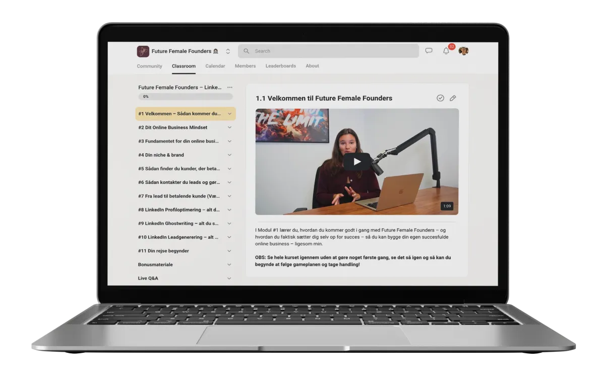 Du får adgang til mere end +60 dybdegående videoer skræddersyet til piger, der vil starte en virksomhed, der kan betale dem 800-1.500 kr. i timen – ligesom min virksomhed gør. Med videoerne lærer du præcis, hvordan du – helt uden erfaring – kan lukke din første kunde og komme i gang med at tjene over 10.000 kr. om måneden.